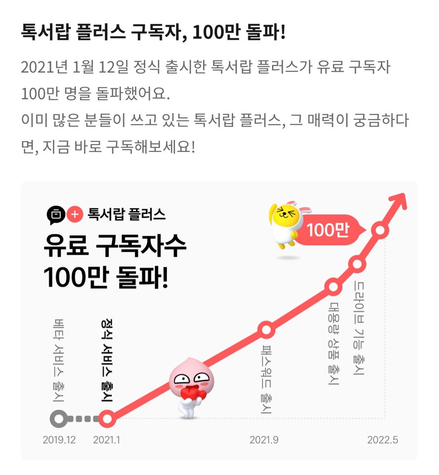 2021112일 톡서랍 플러스 구독자가 100만 명을 돌파했다고 하네요. 벌써 많은 사람들이 이용하고 있었군요.