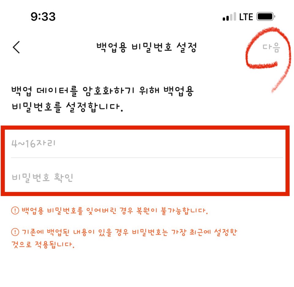 백업용 비밀번호를 설정해주세요. 백업용 비밀번호를 잊어버린 경우에는 복원이 불가능하므로 주의해주세요!!! 더불어 기존에 백업된 내용이 있을 경우 비밀번호는 가장 최근에 설정한 것으로 적용됩니다.