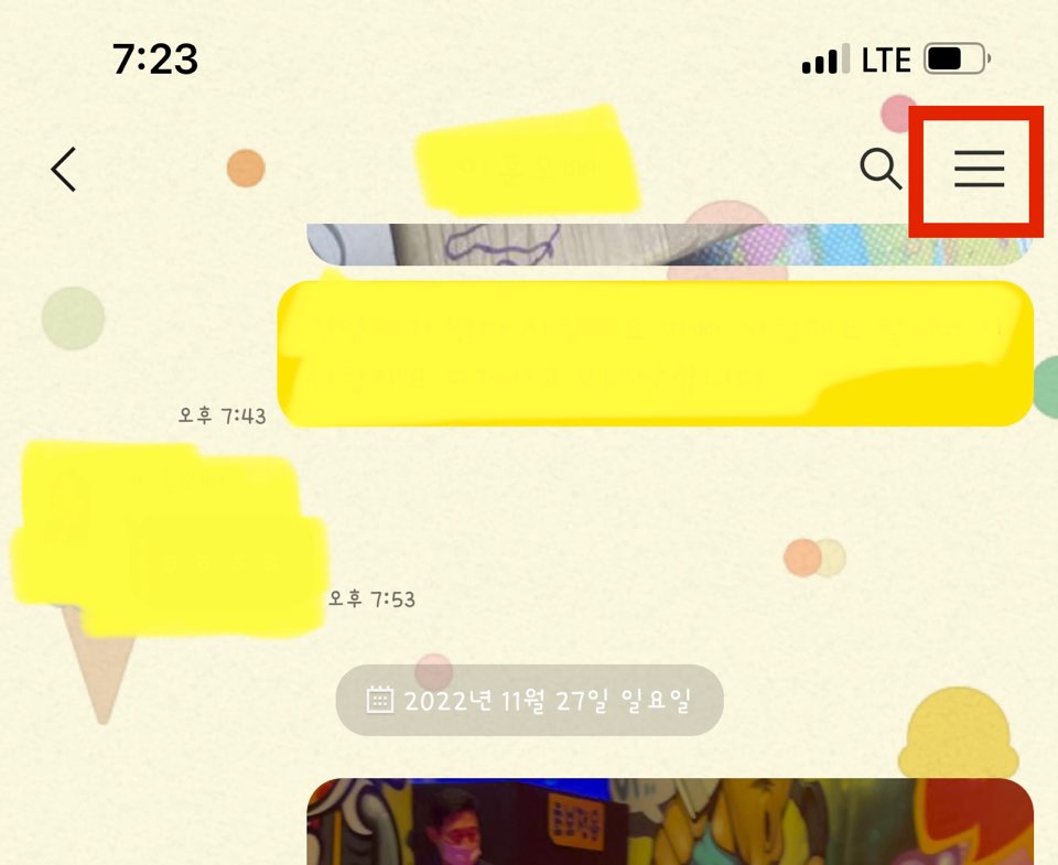 우선 데이터 정리를 하고 싶은 대화방으로 들어가서 오른쪽 상단에 있는 세 줄 모양을 눌러줍니다.