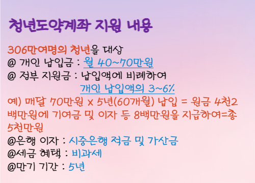 청년도약계좌의 목적은 청년들이 5년에 5천만 원이라는 목돈을 만들 수 있도록 정부에서 지원해 주는 것으로 지원 내용은 다음과 같습니다. 기존에는 만기 10년으로 하고 1억 만들기 형태의 상품으로 기획되었으나, 납입 기간이 너무 길다는 비판으로 5년에 5천만 원으로 바뀌었죠.