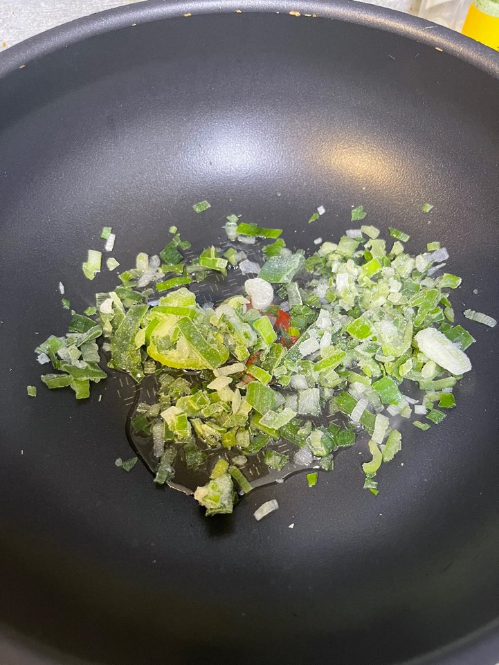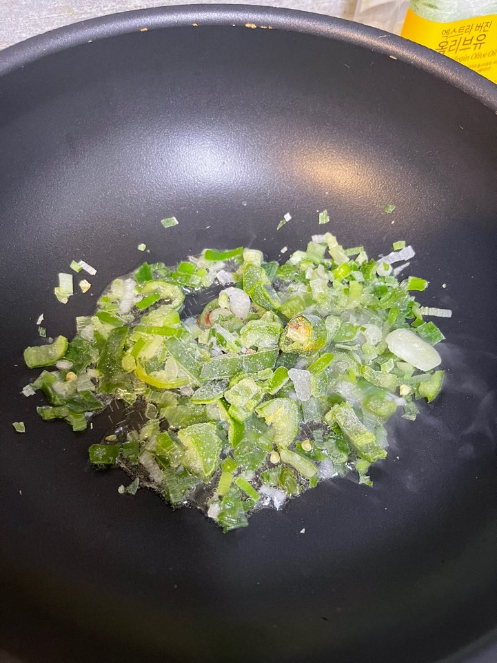 식용유를 넣고 먼저 파를 볶아 기름에서 파향이 나도록 해주세요!!! 저는 이 때 청양고추도 넣어 미리 볶았어요!! 청양고추를 볶기 때문에 매운 맛이 많이 나지는 않지만 먹었을 때 마지막에 나는 살짝 매콤한 맛이 저는 좋더라구요!! 그래서 고추도 함께 넣었지만 생략해주셔도 좋아요!!!