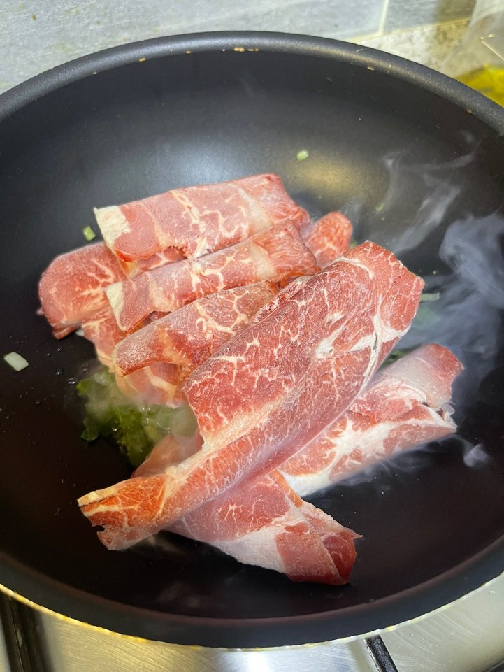 살짝 파기름 향이 나면 차돌박이를 넣어줍니다!! 저는 차돌박이 대신 마라탕 먹고 남은 샤브샤브 고기가 있어서 그걸로 넣어줬어요!!! (마트는 가지 않겠다!!! 무조건 간단함을 추구하는 정신!!!) 그 위로 아까 만들었던 양념장을 부어줍니다!!! 마구마구 볶아주세요!!!