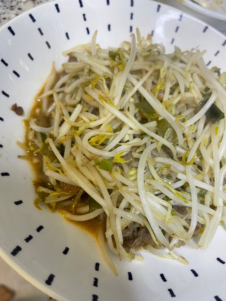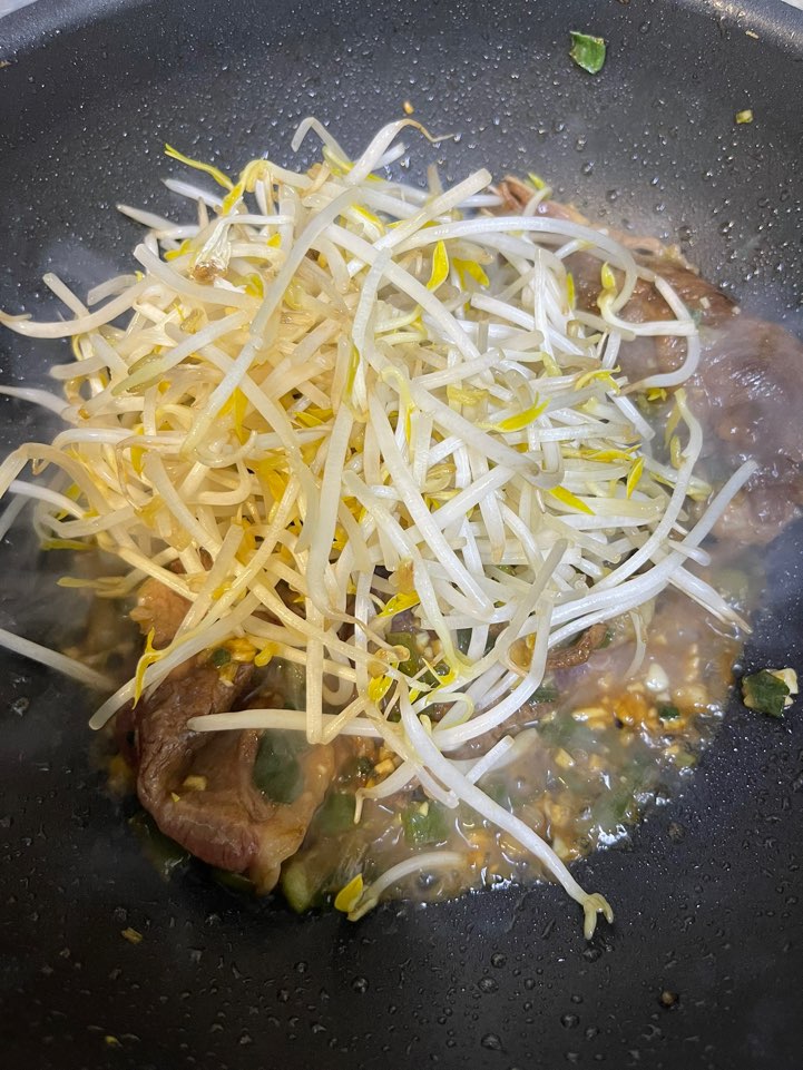 숙주는 아삭함이 생명이기 떄문에 고기가 거의 다 익어간다는 생각이 들면 그 때가 숙주를 넣을 타이밍입니다!!! 숙주를 위에 얹어주고 빠르게 볶아주세요!!! 살짝만 볶으시면 됩니다!!!
