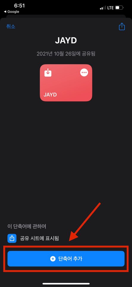 <JARD> 단축어가 다운로드 완료되면 설정 화면이 나타나는데 가장 하단에 위치한 <단축어 추가> 버튼을 눌러 단축어를 추가해주세요!! 그럼 단축어에 추가된 것을 확인하실 수 있어요!!!