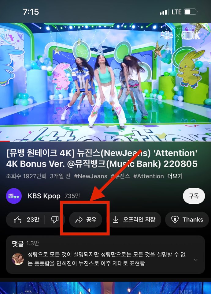 이제 유튜브에 들어가 다운을 받으려고 하는 콘텐츠를 검색하고 영상 하단에 있는 <공유>버튼을 눌러주세요.
