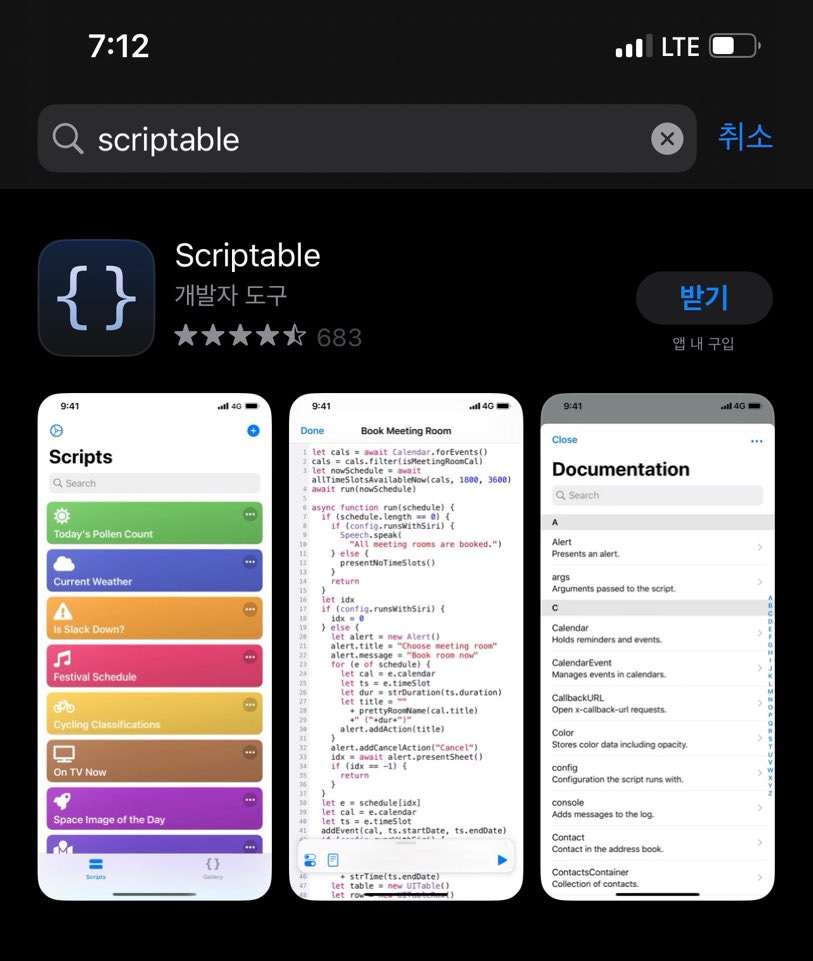 여기에서 다운로드가 되지 않는다면 앱스토어에서 <Scriptable>을 다운받아주시면 해결됩니다.